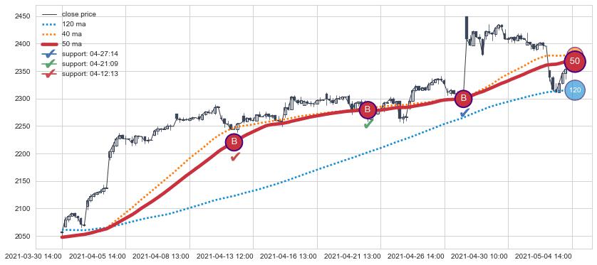 上涨趋势03-30 14:00-05-04 14:00,均线50确认关键支撑3处