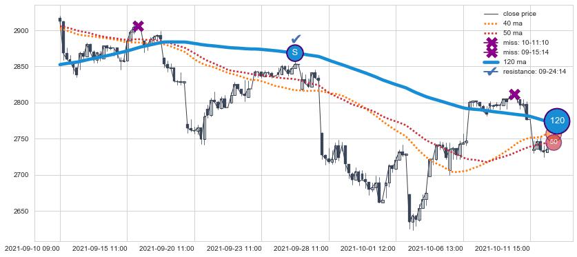 下跌趋势09-10 09:00-10-12 13:00,均线120确认关键阻力1处