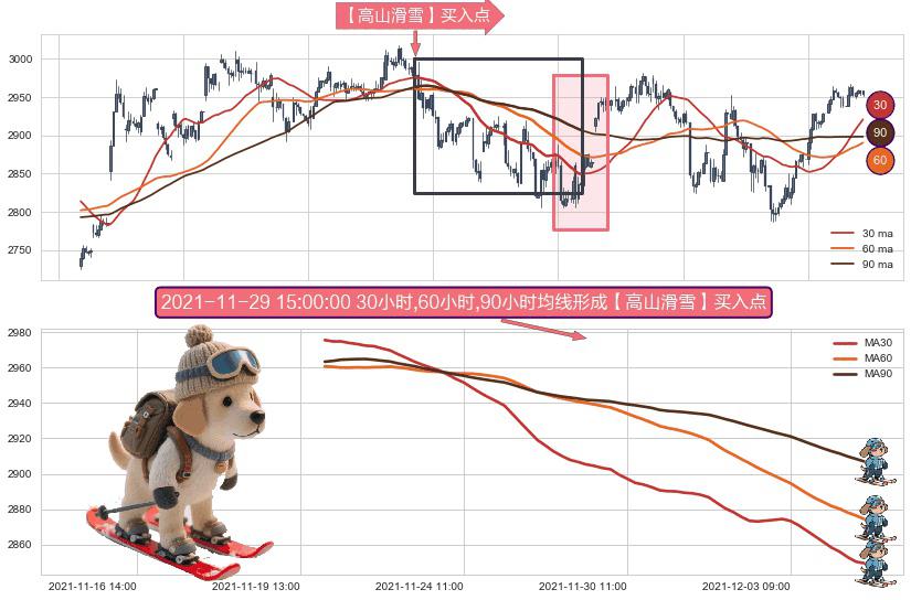 形态多维评估: ⚀ 2021-11-19 16:00:00小时-2021-12-06 11:00:00小时显现 30小时-60小时-90小时均线 【高山滑雪】买入点 看多信号,后市看涨,买入