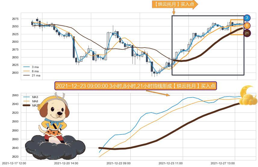 形态多维评估: ⚀ 2021-12-21 11:00:00小时-2021-12-27 15:00:00小时显现 3小时-8小时-21小时均线 【烘云托月】买入点 看多信号,后市看涨,买入