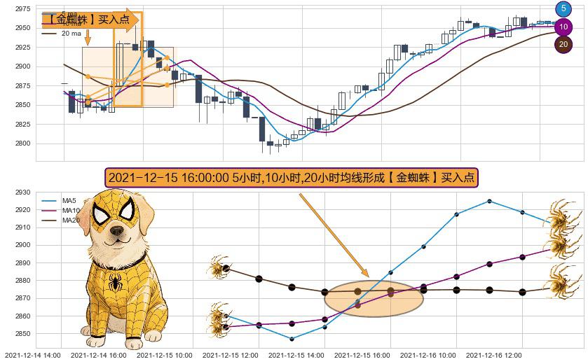 形态多维评估: ⚀ 2021-12-15 16:00:00小时显现 5小时-10小时-20小时均线 【金蜘蛛】买入点 看多信号,后市看涨,买入