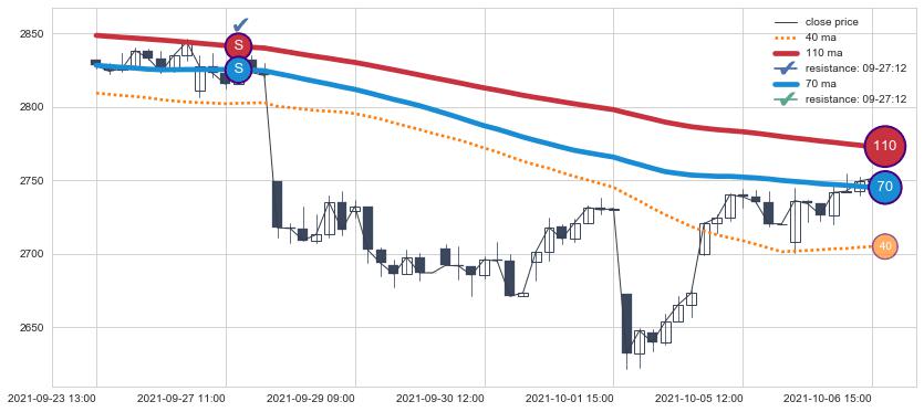 下跌趋势09-23 13:00-10-06 15:00,均线70, 110确认关键阻力1处