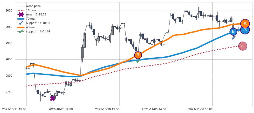 上涨趋势10-21 12:00-11-10 12:00,均线40, 70确认关键支撑2处
