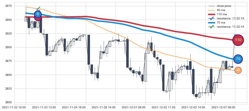 下跌趋势11-22 10:00-12-07 09:00,均线70, 110确认关键阻力1处