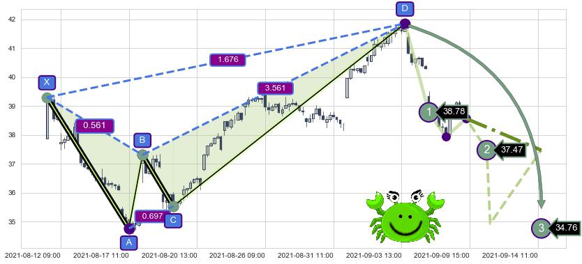 | 5 🅚:下跌两颗星 | 下跌三颗星 ➕ 📡:谐波螃蟹已到达d点:猜想c拉升到达d点后泄力性下沉下跌(均值回复) ☞ 看空信号 ⇥ 【🅚线】交织【图形】⇥ 综合量化分数: 42 | > |