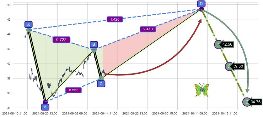 ➣ 未完成【蝴蝶】形态起点X: 08-10:13, 已到达C点: 09-08:14, 预测最终D点: 10-07:15, 共286交易小时