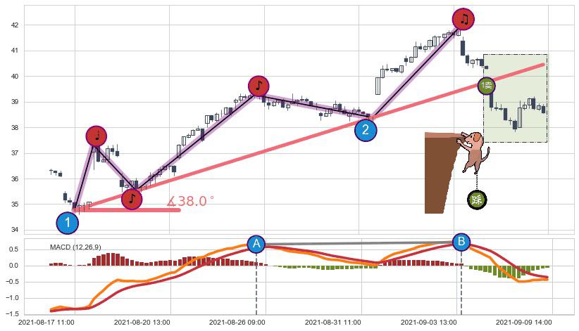 从2021-08-17 11:00至2021-09-08 09:00,共包含89个小时,阶段股价上涨11.57%,阶段股价变动位移路程比: 1 : 5,上涨趋势角度: 38.0