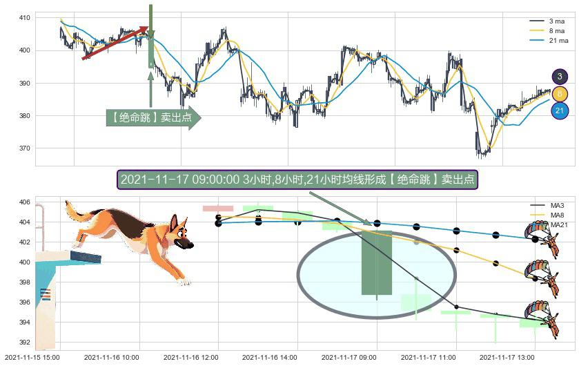 形态多维评估: ⚀ 2021-11-17 09:00:00小时显现 3小时-8小时-21小时均线 【绝命跳】卖出点 看空信号,后市看跌,卖出