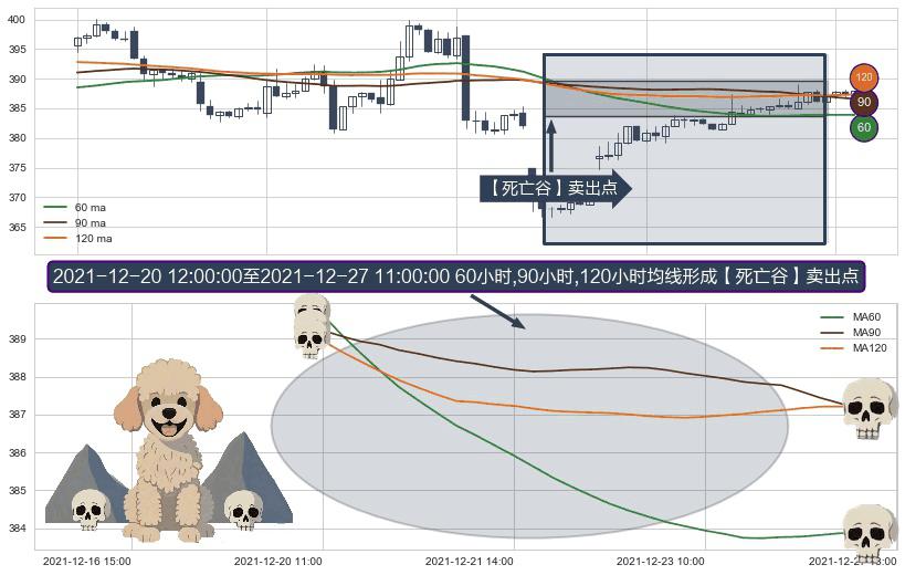 形态多维评估: ⚀ 2021-12-20 13:00:00-小时至2021-12-27 11:00:00-小时显现 60小时-90小时-120小时均线 【死亡谷】卖出点 看空信号,后市看跌,卖出