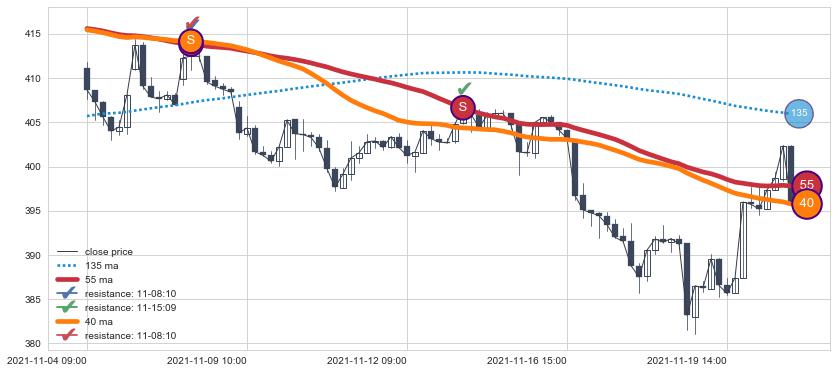 下跌趋势11-04 09:00-11-22 15:00,均线40, 55确认关键阻力2处