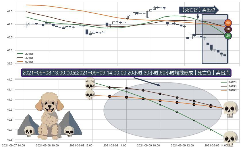 ⚀ 2021-09-08 14:00:00-小时至2021-09-09 14:00:00-小时显现 20小时-30小时-60小时均线 【死亡谷】卖出点 看空信号,后市看跌,卖出