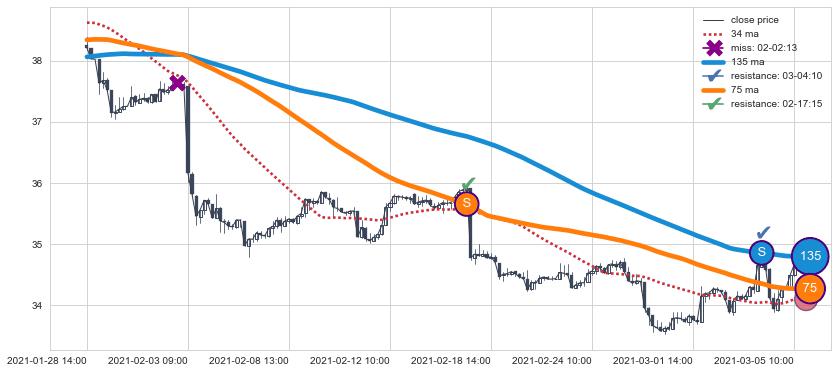 ⚅ 卖点向下突破均线后,价格走势有持续向下的迹象,但动能稍显不足,迟迟不能远离均线