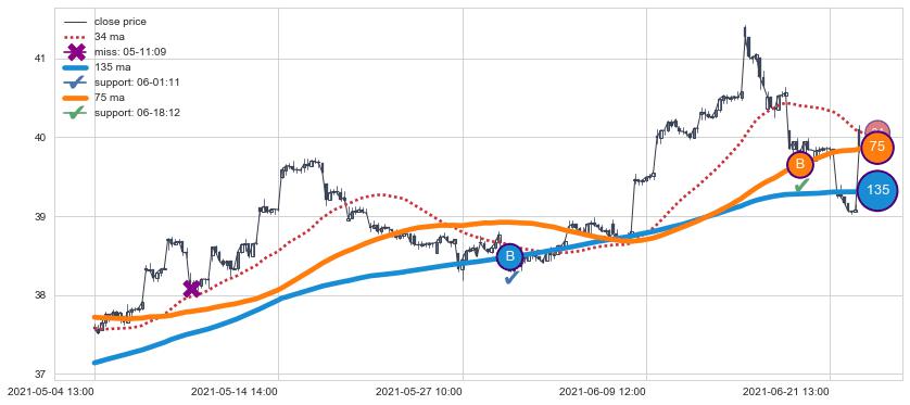 ⚁ MA3和MA8走势平行,且始终保持在短距离内,MA21始终在短中期均线上方,与短中期均线保持一定的距离,微微下行