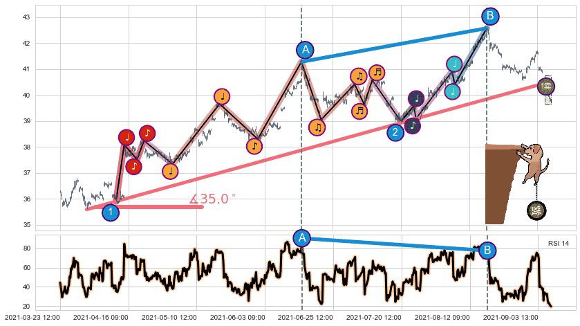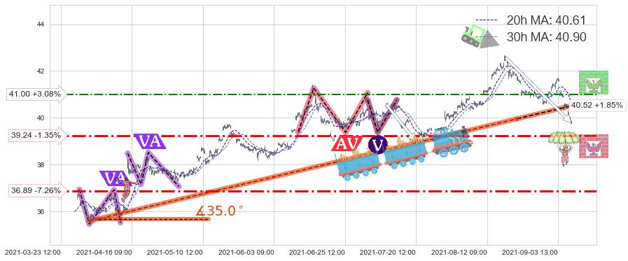 ➣ 2021-03-31 15:00-2021-08-23 09:00上升趋势存在反转[风险],其原上升趋势的支撑位(40.52)已破位[强阻力信号],原上升趋势角度: 35.0˚