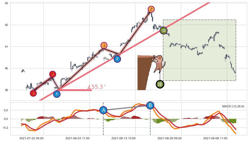 从2021-07-20 12:00至2021-08-23 09:00,共包含143个小时,阶段股价上涨6.85%,阶段股价变动位移路程比: 1 : 3,上涨趋势角度: 55.3