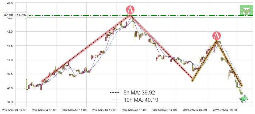2021-08-18: 第一阻力位42.58强力阻拦了上升趋势,成功阻止了价格的继续上涨。