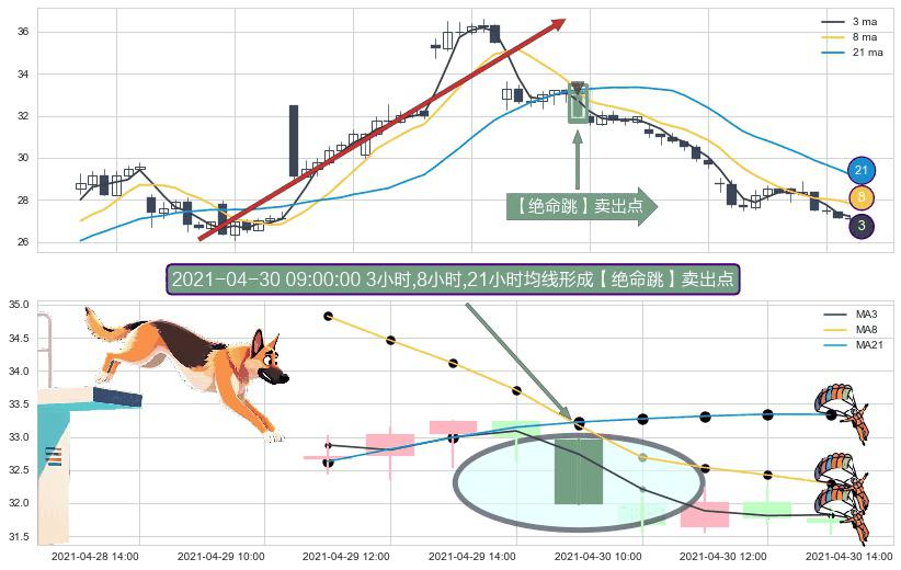 ⚀ 2021-04-30 09:00:00小时显现 3小时-8小时-21小时均线 【绝命跳】卖出点 看空信号,后市看跌,卖出