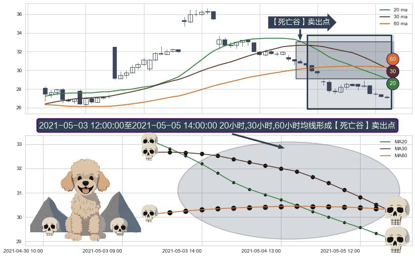 ⚀ 2021-05-03 13:00:00-小时至2021-05-05 14:00:00-小时显现 20小时-30小时-60小时均线 【死亡谷】卖出点 看空信号,后市看跌,卖出