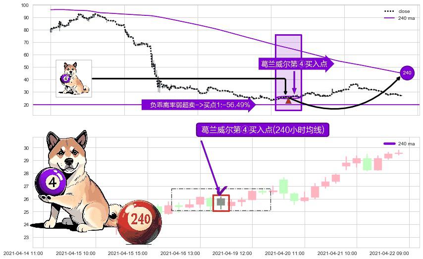 ⚀ 2021-04-19 09:00:00-小时显现 葛兰威尔均线 240小时均线 第④买入点 下降趋势均值回复的短线反弹信号,后市看涨,买进信号