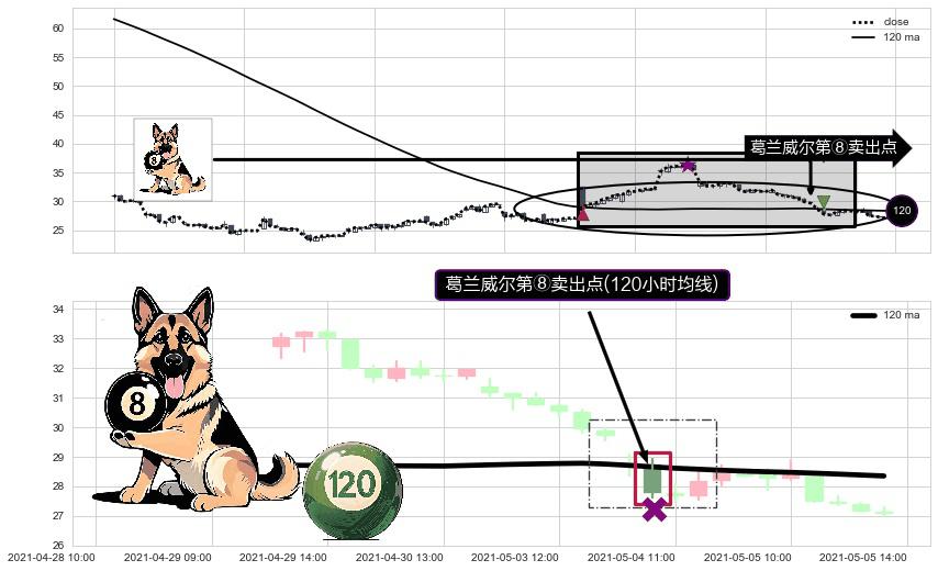 ⚀ 2021-05-04 10:00:00-小时显现 葛兰威尔均线 120小时均线 第⑧卖出点 下降趋势的中继信号,后市看跌,卖出信号