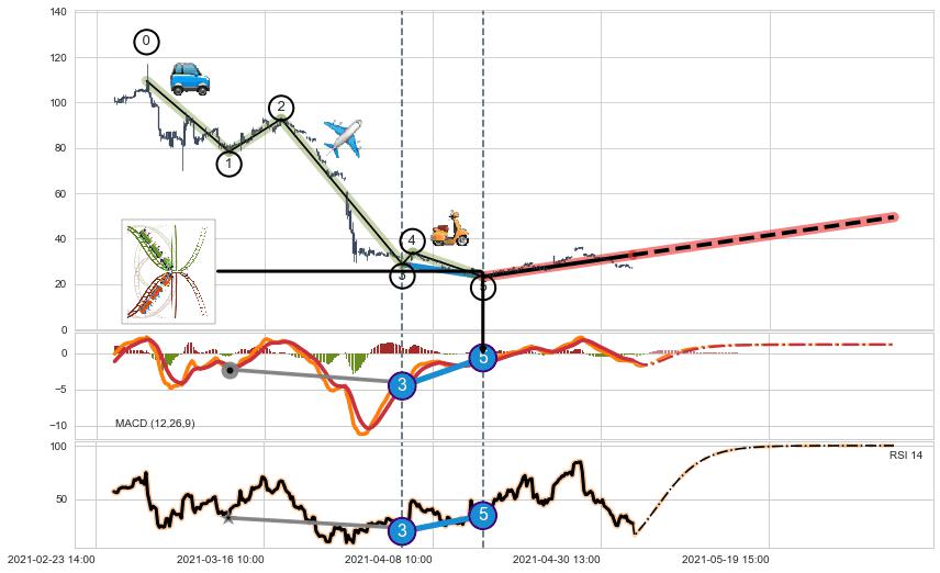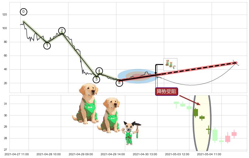 | 4 🅚:底部尽头线(上山虎) ➕ 🌊:波浪理论猜想下跌浪5已形成,猜想后续形成abc反弹上涨(均值回复) ☞ 看多信号 ⇥ 【🅚线】交织【图形】⇥ 综合量化分数: 51 | > |