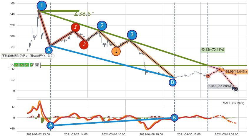 从2021-01-27 13:00至2021-04-27 11:00,共包含411个小时,阶段股价下跌-127.66%,阶段股价变动位移路程比: 1 : 6,下跌趋势角度: 38.5
