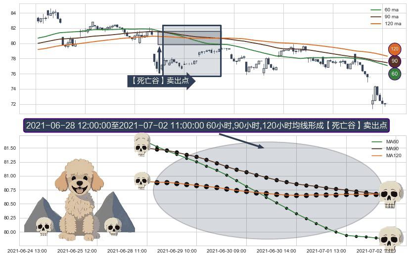 形态多维评估: ⚀ 2021-06-28 13:00:00-小时至2021-07-02 11:00:00-小时显现 60小时-90小时-120小时均线 【死亡谷】卖出点 看空信号,后市看跌,卖出