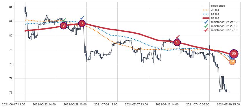 下跌趋势06-17 13:00-07-19 15:00,均线85确认关键阻力3处