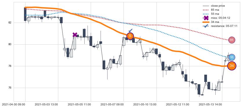 下跌趋势04-30 09:00-05-14 10:00,均线34确认关键阻力1处