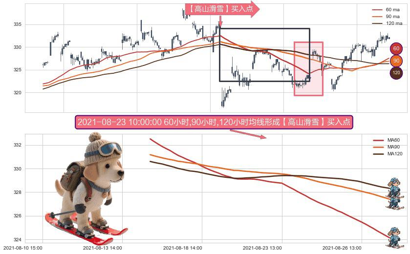 ⚀ 2021-08-16 14:00:00小时-2021-08-27 13:00:00小时显现 60小时-90小时-120小时均线 【高山滑雪】买入点 看多信号,后市看涨,买入