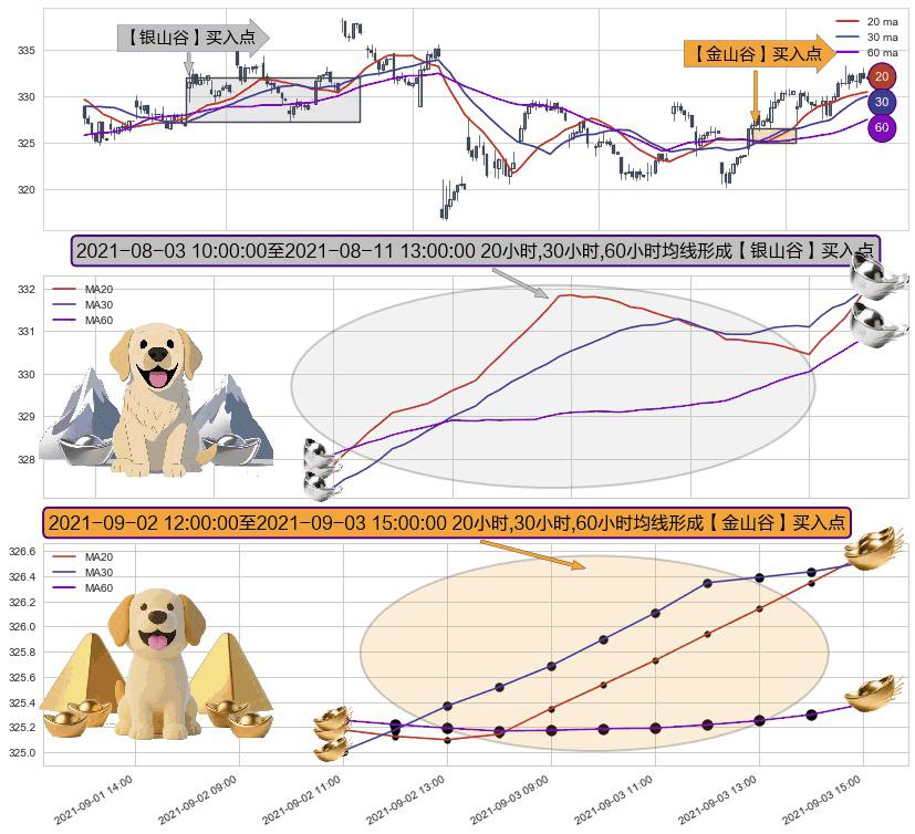 ⚀ 2021-09-02 13:00:00-小时至2021-09-03 15:00:00-小时显现 20小时-30小时-60小时均线 【金山谷】买入点 其再次确认了买入信号,可靠性更强,买入