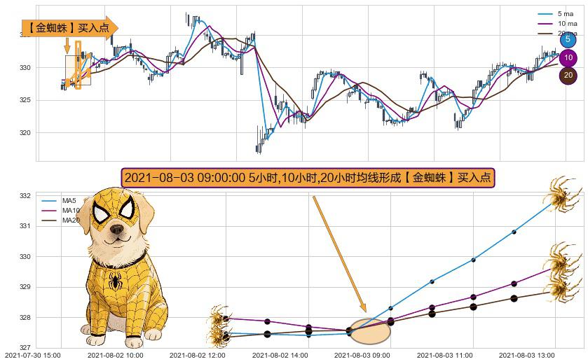 ⚀ 2021-08-03 09:00:00小时显现 5小时-10小时-20小时均线 【金蜘蛛】买入点 看多信号,后市看涨,买入