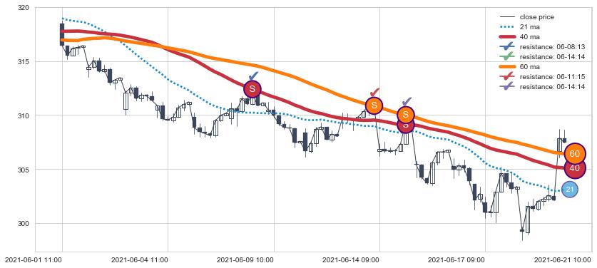 ⚀ 2021-08-13 09:00:00小时显现 20小时-30小时-60小时均线 【断头铡刀】卖出点 看空信号,后市看跌,卖出