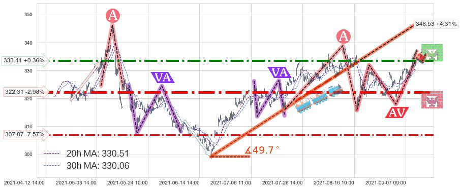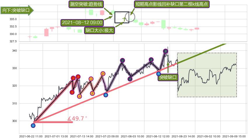 ✂️ 2021-06-18 09:00-2021-08-16 14:00上升趋势存在反转[风险],其原上升趋势的支撑位(346.53)已破位[强阻力信号],原上升趋势角度: 49.7˚