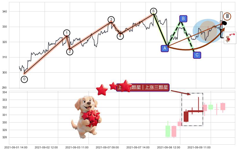| 4 🅚:中流砥柱形态 ➕ 🌊:波浪理论上涨5浪延续:猜想C点强支撑小回调终止,猜想保持上涨5浪方向拉升(均值回复后大周期继续趋势跟踪) ☞ 看多信号 ⇥ 【🅚线】交织【图形】⇥ 综合量化分数: 51 | > |