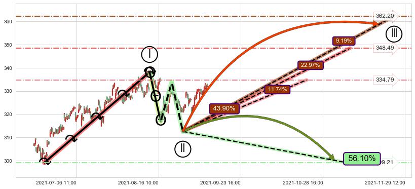 ➢ 循环浪继续向上【最低】位置(10-21:16, 334.79),匹配聚类样本比例26.74%, 可能性概率11.74%