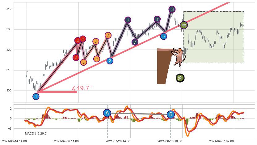 从2021-07-19 13:00至2021-08-16 14:00,共包含140个小时,阶段股价上涨5.54%,阶段股价变动位移路程比: 1 : 6,上涨趋势角度: 52.6