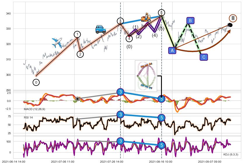➣ 1,3,5驱动浪MACD, RSI, KDJ走势都出现【常规背离】反转信号增强