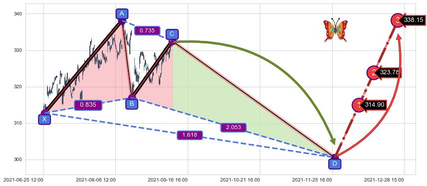 ➢ 距离预测D点位置有足够的下跌空间, 与看涨【蝴蝶】形态相反,实际方向【看跌】