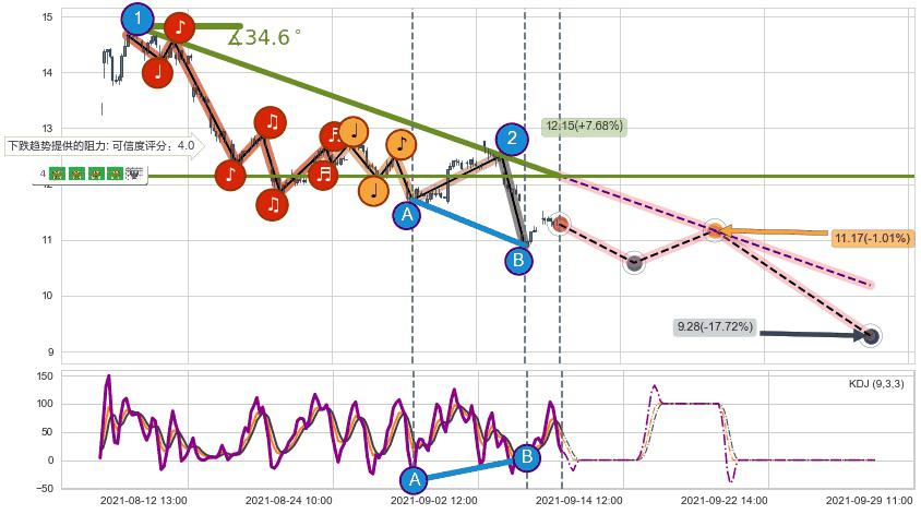 ➣ 预测:2021-09-20 13:00,【试探阻力】稳定目前下跌趋势的前提下,预测价格:11.17