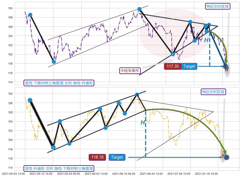 ➣ 【已确认突破】下降【对称】三角形整理 起点:06-15:12,突破点:07-13:09,形态共126交易小时