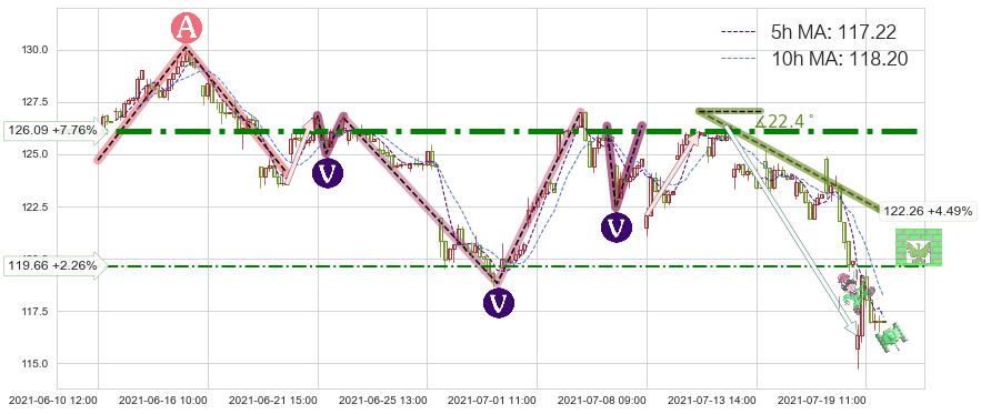 ♘ 阻力价格位119.66,可信任强度40.91%,距离最后交易2021-07-19 15:00形成的收盘价格117.01相差 +2.26%