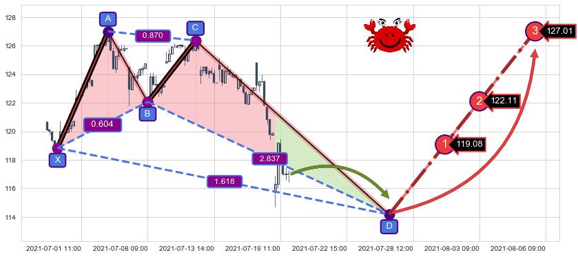 ➢ 距离预测D点位置尚有下跌空间,短线依然【看跌】, 耐心等待看涨【螃蟹】形态反转启动