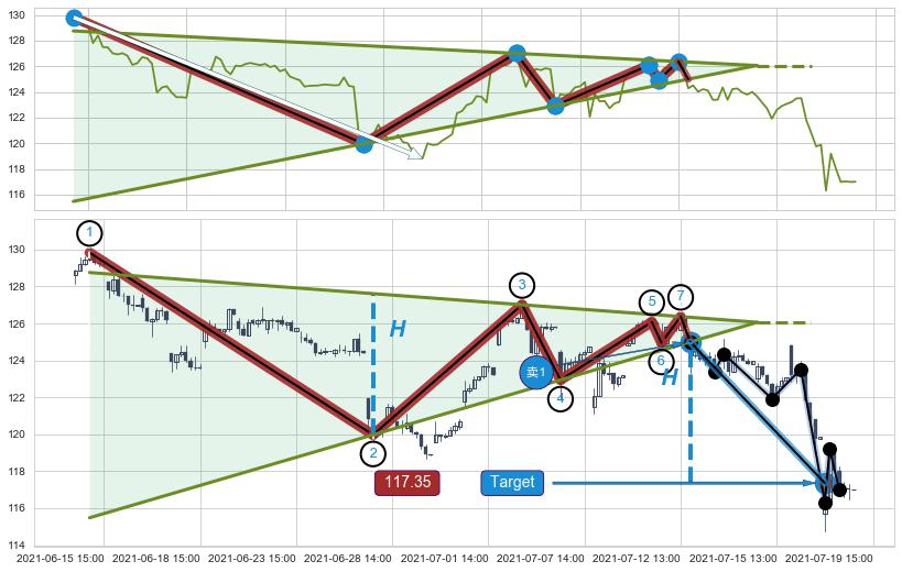 ➣ D点拟合预测价格114.17,距离最后交易收盘价格117.01相差 -2.43%
