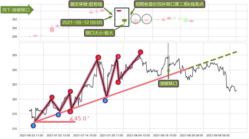 ➣ 2021-06-18 14:00-2021-08-19 14:00上升趋势存在反转[风险],其原上升趋势的支撑位(236.17)已破位[强阻力信号],原上升趋势角度: 45.0˚