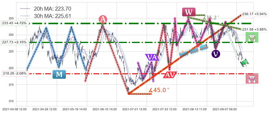 ♘ 阻力价格位233.45,可信任强度99.00%,距离最后交易2021-09-09 15:00形成的收盘价格222.93相差 +4.72%