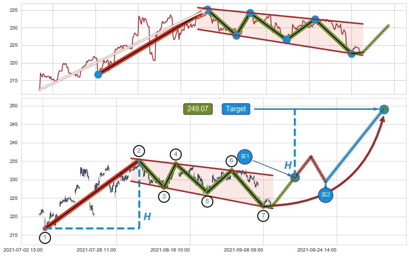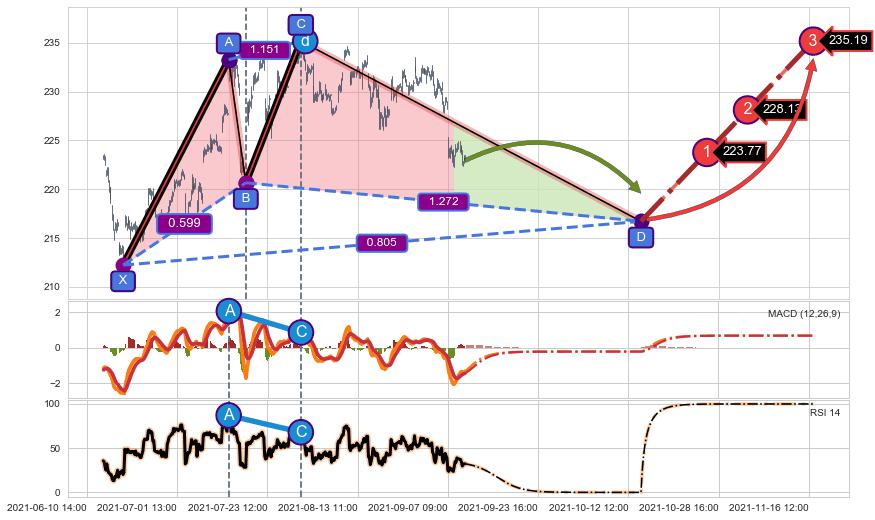 ➣ D点拟合预测价格216.71,距离最后交易收盘价格222.93相差 -2.79%