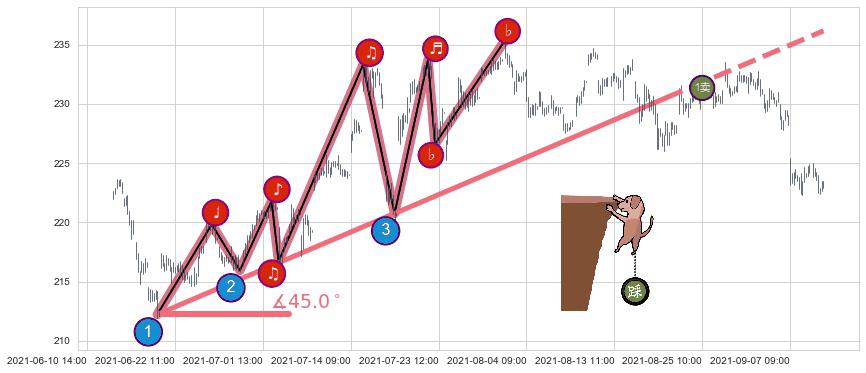 ✂️ 2021-06-18 14:00-2021-08-19 14:00上升趋势存在反转[风险],其原上升趋势的支撑位(236.17)已破位[强阻力信号],原上升趋势角度: 45.0˚
