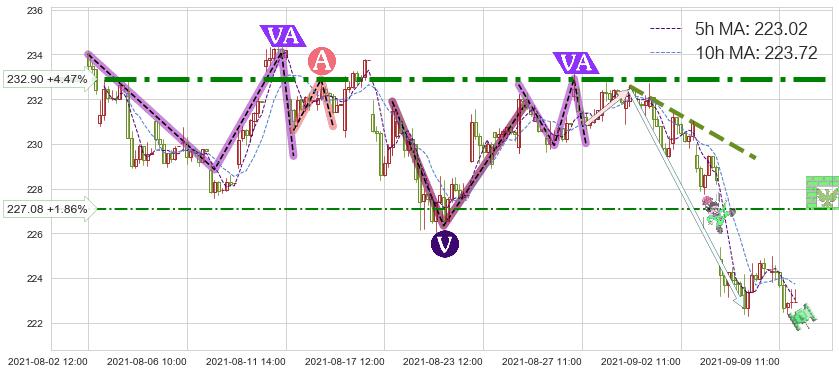 ♘ 阻力价格位232.90,可信任强度99.00%,距离最后交易2021-09-09 15:00形成的收盘价格222.93相差 +4.47%