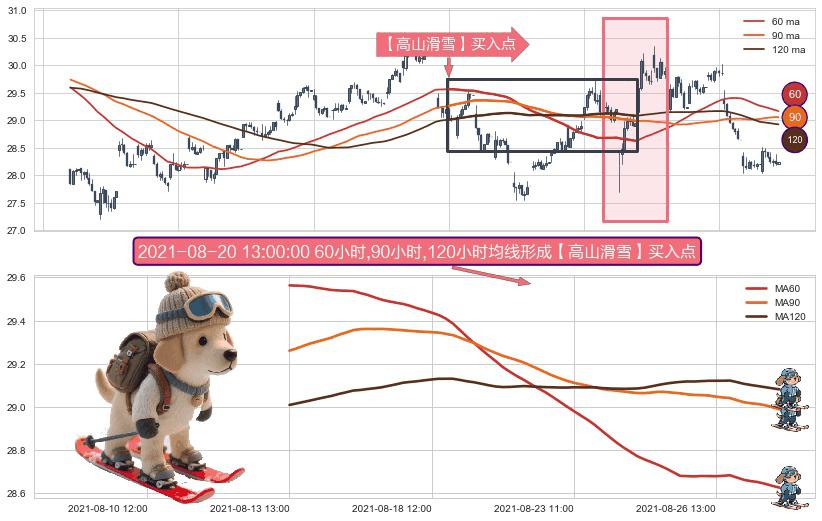 ⚀ 2021-08-13 13:00:00小时-2021-08-27 15:00:00小时显现 60小时-90小时-120小时均线 【高山滑雪】买入点 看多信号,后市看涨,买入